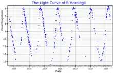 R Horologii is a red giant star approximately 1,000 light-years away in the southern constellation of Horologium.[10] It is a Mira variable with a period of 404.83 days,[11] ranging from apparent magnitude 4.7 to 14.3—one of the largest ranges in brightness known of stars in the night sky visible to the unaided eye.[2] The star is losing mass at the rate of 5.9×10−7 M☉·y−1.[7]