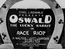 Race Riot is a 1929 animated short film which is presented by Carl Laemmle and was produced by Walter Lantz,[1] who would go on to produce and create the cartoon character Woody Woodpecker with his wife,[2] Gracie Lantz.[3] The film, which both its story and animation was composed by Walter Lantz, 'Bill' Nolan and Tom Palmer,[1] features Oswald the Lucky Rabbit,[1] as he attempts to win a horse race with his horse.[1] The horse's coughs were done by Walter Lantz.