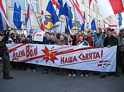 Since the late 1980s, 25 March, the Independence Day of the Belarusian Democratic Republic, is widely celebrated by the Belarusian national democratic opposition as Freedom Day (Belarusian: Дзень волі). It is usually accompanied by mass opposition rallies in Minsk and by celebration events of the Belarusian diaspora organizations supporting the Belarusian government in exile.