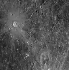 MESSENGER image. Raden Saleh is the crater with bright rays in the upper left.