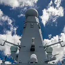 A radome (a portmanteau of radar and dome) is a structural, weatherproof enclosure that protects a radar antenna.[1] The radome is constructed of material transparent to radio waves. Radomes protect the antenna from weather and conceal antenna electronic equipment from view. They also protect nearby personnel from being accidentally struck by quickly rotating antennas.