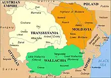 3. Radu's full claimed titles were "Duke of Wallachia, Moldavia and Bessarabia, despot of the Peloponnese, prince of Thessaly, Macedonia and the Holy Roman Empire, of both empires, Count of Epidaurus, Corinth and apostolic count of the Kingdom of Hungary, marquis of Ilfov, Romanați, Teleorman, Suceava, dynast in Galați, Ialomița, Prahova and Dâmbovița, and lord of Oltenia and the Mehedinți Mountains, hospodar of Hotin and Giurgiu, as well as the mines of Telegei, on either side of the Danube, baron of Moghilău, Zănoaga, Afumați, of the two Filipești and of the other territories, fiefs, places and dominions of the serene House of the Cantacuzins in Ukraine and Transylvania".[18]