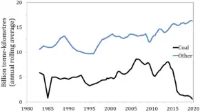 The railway network in Great Britain has been used to transport goods of various types and in varying volumes since the early 19th century. Network Rail, which owns and maintains the network, aims to increase the amount of goods carried by rail.[3] In 2015–16 Britain's railways moved 17.8 billion net tonne kilometres, a 20% fall compared to 2014–15.[4] Coal accounted for 13.1% of goods transport in Britain, down considerably from previous years.[4] There are no goods transported by railway in Northern Ireland.[5]