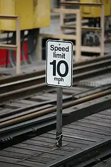 A 10-mile-per-hour (16 km/h) speed restriction sign along the Chicago "L".