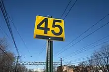 A 45-mile-per-hour (72 km/h) speed restriction sign at Metro-North Railroad's Port Chester station.