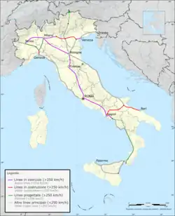 The Italian railway system is one of the most important parts of the infrastructure of Italy, with a total length[3] of 24,227 km (15,054 mi) of which active lines are 16,723 km.[2] The network has recently grown with the construction of the new high-speed rail network. Italy is a member of the International Union of Railways (UIC). The UIC Country Code for Italy is 83.