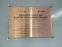 The contemporary MRT system uses the 1,435mm standard track gauge with the elevated lines also having guard rails to prevent a derailed vehicle from striking fixed obstructions and viaduct parapets by keeping derailed wheels adjacent to the running rails. Three types of rail tracks are used on the MRT: ballasted track, fixed slab track and floating slab track; floating slab tracks are used at sections of the rail network located beneath densely populated and built-up areas to alleviate vibration and noise transmission to neighbouring buildings, by means of interposing rubberised supports between the tunnel wall and the tracks.[47] When initially built, the MRT used swingnose crossings for 26 out of 131 railway points to minimise noise. From July to November 2000, these swingnose crossings were replaced with conventional ones for reliability reasons.[48]