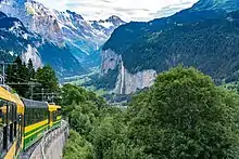 The Berner Oberland Bahn (BOB) is a 24-kilometre line from Interlaken to Lauterbrunnen and Grindelwald. It begins at Interlaken Ost station and divides at Zweilütschinen, about 10 kilometres south of Interlaken. The western branch leads to Lauterbrunnen, while the eastern branch leads to Grindelwald. It is possible to make a loop by taking the Lauterbrunnen branch and returning via the Grindelwald branch. The two branches are connected by the Wengernalp Bahn.