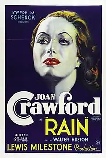Rain is a 1932 pre-Code drama film that stars Joan Crawford as prostitute Sadie Thompson. Directed by Lewis Milestone and set in the South Seas, the production was filmed in part at Santa Catalina Island and what is now Crystal Cove State Park in California. The film also features Walter Huston in the role of a conflicted missionary who insists that Sadie end her evil ways, but whose own moral standards and self-righteous behavior steadily decay. Crawford was loaned out by MGM to United Artists for this film.