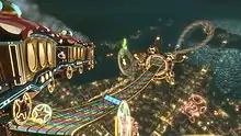 In Mario Kart 8 as well as Mario Kart 8 Deluxe, the track uses three whole laps again instead of lap sections, and there is again a planet in the background with a higher resolution than the one from Mario Kart Wii. This track is the first one to exploit the idea of gliding upon solar panels on a space station, giving a plausible explanation to the track's premise of a rainbow-colored track suspended in outer space. The ground uses quadratic tiles in resemblance to the original Rainbow Road (Super Mario Kart). At the start/finish line, the track crosses through a space craft filled with Toads sit on tribunes as on a normal racetrack. Several more space ships carry parts of the track, most notably the one with two circular conveyor belt rotating rings in opposing directions which can speed up or slow down the vehicle that drives upon.[8] As with other Mario Kart 8 tracks, Rainbow Road's surface is wildly twisted, forcing racers to make use of the new anti-gravity feature. At a location, two separated parts of the track cross nearby in different angles, and distant parts of the track can be seen ahead from far away.[9] According to Mario Kart 8 Deluxe producer Kosuke Yabuki, the development team's goal was to create a version of Rainbow Road with a "near-future" aesthetic when anti-gravity controls were added.[10][11]
