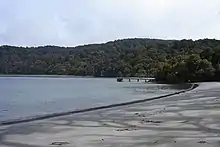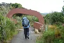 Rakiura National Park covers close to 1,400 square kilometres (540 sq mi),[3] which is about 85% of Stewart Island / Rakiura, New Zealand's third-largest island. The park area excludes the township area around Halfmoon Bay (Oban) and some roads as well as private or Maori-owned land further inland.[1] It is made up of a network of former nature reserves, scenic reserves, and State Forest areas. A chain sculpture at the entrance to Rakiura National Park symbolises the Māori mythology of the island, which held that the South Island was the canoe of the demigod Māui and that Rakiura was the canoe's anchor, as evidenced by an alternative name for the island of "Te Punga o Te Waka a Māui" (the anchor of Maui's canoe).[4] The sculpture was designed by noted Southland sculptor Russell Beck, and was unveiled as part of the opening of the national park.[5][1] In 2008, a similar sculpture was erected in Bluff, and it represents the other end of the chain.[6]