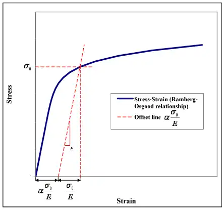 Alternatively, if the yield stress, , is assumed to be at the 0.2% offset strain, the following relationship can be derived.[5] Note that is again as defined in the original Ramberg-Osgood equation and is the inverse of the Hollomon's strain hardening coefficient.