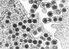 Transmission electron micrograph of ranaviruses (dark hexagons) gathering at the cell border and leaving the cell via a process called "budding".