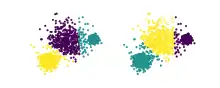 Example clusterings for a dataset with the kMeans (left) and Mean shift (right) algorithms. The calculated Adjusted Rand index for these two clusterings is