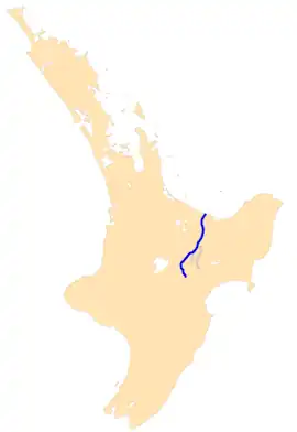 The Rangitaiki River is the longest river in the Bay of Plenty region in New Zealand's North Island. It is 155 kilometres (96 mi) long, and rises inland from northern Hawkes Bay to the east of the Kaingaroa Forest. The Rangitaiki catchment covers an area of 3005 km2.[2] It flows in a generally northeastward direction, passing through the town of Murupara and skirting close to the western edge of Te Urewera National Park before turning northwards, flowing past Edgecumbe and into the Bay of Plenty close to Thornton.