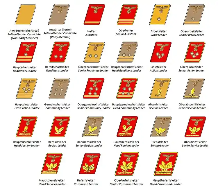 Ranks and insignia were used by the National Socialist German Workers' Party (NSDAP) as paramilitary titles between approximately 1928 and the fall of Nazi Germany in 1945. Such ranks were held within the political leadership corps of the Nazi Party, charged with the overseeing of the regular Nazi Party members.
