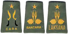 Penegak Laksana is a level after Penegak Bantara in Penegak age group. A Scout can earn this level after they fulfill requirements from the Penegak/Rover Handbook. One can be easily identified as Penegak Laksana by the shoulder board on his/her uniform. The difference between the Bantara and Laksana shoulder board is the word written on it. The color and sign is the same between Bantara and Laksana. In Penegak group, the only shoulder loop that looks different is the CARA (Calon Bantara) or Bantara Cadet, where the logo is not the Tunas Kelapa (coconut sprout), but the kujang, an Indonesian traditional weapon, from West Java), and the word written: CARA (Calon Bantara) or Bantara Cadet.