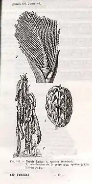 The trunk of this species is up to 10 m tall and about 1 m in diameter – the topmost fronds reach up a further 10 m – and sheathed in persistent leaf bases.[3] Trees occur singly or, because of suckering, in dense clumps. The pendant inflorescences are massive and some 3 m in length, bearing unisexual flowers – male flowers at the distal end, female flowers at proximal – with first order branches of 13–32 rachillae very close-packed in almost one plane (see illustration). Raphia spp. are monocarpic or hapaxanthic, flowering and fruiting only once, followed by death. Raphia farinifera flowers when the tree is some 20–25 years old, and it takes a further 5–6 years from flowering to ripe fruit, all fruits ripening together. The fruit is oblong to ovoid, 5–10 cm in length, with imbricate, glossy, golden-brown scales.