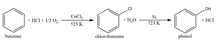 The main steps in this process are the production of chlorobenzene from benzene, hydrochloric acid and oxygen, and the subsequent hydrolysis of chlorobenzene to phenol.[4] The first step uses either a copper or iron chloride catalyst and exposes the materials to air at 200–250 °C.[5][6][7][8] In the second step, the resulting chlorobenzene is introduced to steam at 450 °C over a silicon catalyst that hydrolyses the chlorobenzene, giving phenol and hydrogen chloride that can then be recycled back to the first step.[6][7] Due to the two step nature, the Raschig–Hooker process can be used to produce either chlorobenzene or phenol.