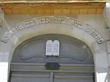 The Impost and below the arch of the entrance includes a representation of the Ten Commandments. Carved into the stone arch is an excerpt from Psalm 118, verse 9, which reads: « פִּתְחוּ-לִי שַׁעֲרֵי-צֶדֶק; אָבֹא-בָם, אוֹדֶה יָהּ », translated to Open to me the Gates of Righteousness I will enter into them, I will give thanks unto the LORD.[13] Psalm 118 is the last psalm uttered as part of the Hallel prayers, read during most biblical Jewish holidays and on days of worship.