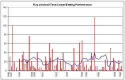 - ↑ "Statsguru – RR Lindwall – Test matches – Batting analysis". Cricinfo. Retrieved 19 June 2008.
