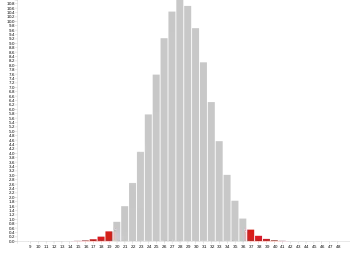 A chart might list numbers from 8 through to 48, where a result in a middle range of 20 through 36 is shown as scoring the player nothing, while results 8 through 19 and 37 through 48 all pay out. Visually this would mean that more than half of the squares on the chart showed a payout (with 22 winning squares and only 16 losing ones), and a player might instinctively conclude that more than half of their throws will pay out. In reality, more than 98% of a player's throws will give a total somewhere in the 20-to-36 range.