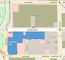 City Mall was the main shopping area in central Christchurch. The pedestrian mall was made up of two blocks of Cashel Street (from Oxford Terrace to High Street), and one block of High Street (from Cashel Street to Hereford Street). The central city including buildings in City Mall suffered some damage in the 4 September 2010 Canterbury earthquake. Although lower in magnitude, the 2010 Boxing Day earthquake was more damaging as the epicentre was directly located under the central city.[1] It was the 22 February 2011 Christchurch earthquake that all but devastated the city centre, when many of the building façades of the historic buildings in the mall collapsed.[2]