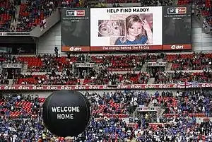 A video appealing for help with the search for Madeleine was broadcast to Spanish football fans visiting the city of Glasgow for the 2007 UEFA Cup Final on 16 May.[106] Another film was aired at half-time during the English FA Cup Final on 19 May.[107] Before their departure for the 2007 UEFA Champions League Final on Monday 21 May, Liverpool's squad were photographed with a banner appealing for any information on Madeleine's whereabouts.[19]