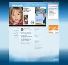 An official website for the search was set up, and the McCann family broadcast two early video appeals.[2] The first was a photograph and video montage set to Simple Minds' song "Don't You (Forget About Me)" and included an animation of the word LOOK in uppercase with a reproduction of her coloboma as a radial line inside the first letter O, which blinks.[3] The second featured a montage of images with a voice-over by actress Zoë Wanamaker mentioning her coloboma, seeking information about her whereabouts, and asking people to download and display a poster of her from the official site.[4]