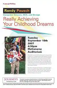 "Really Achieving Your Childhood Dreams" (also called "The Last Lecture"[1]) was a lecture given by Carnegie Mellon University computer science professor Randy Pausch on September 18, 2007,[2] that received widespread media coverage, and was the basis for The Last Lecture, a New York Times best-selling book co-authored with Wall Street Journal reporter Jeffrey Zaslow.[3] Pausch had been diagnosed with pancreatic cancer in September 2006. On September 19, 2006, Pausch underwent a pancreaticoduodenectomy to remove the malignant tumor from his pancreas.[4] In August 2007, doctors discovered that the cancer had recurred. Pausch was given a terminal diagnosis and told to expect that three to six months of good health remained.[5]