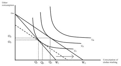For cost reducing resource efficiency, distinguishing between direct and indirect effects is shown in Figure 1 below. The horizontal axis shows units of consumption of the targets good (which could be for example clothes washing, and measured in terms of kilograms of clean clothes) with consumption of all other goods and services on the vertical axis. An economical technology change that enables each unit of washing to be produced with less electricity results in a reduction of the price per unit of washing. This shifts the household budget line rightwards. The result is a substitution effect because of the decreased relative price, but also an income effect due to the increased real income. The substitution effect increases consumption of washing from Q1 to QS, and the income effect from QS to Q2. The total increase in consumption of washing from Q1 to Q2 and the resulting increase in electricity consumption is the direct effect. The indirect effect comprises the increase in other consumption, from O1 to O2. The scale of each of these effects depends on the elasticity of demand for each of the goods, and the embodied resource or externality associated with each good. Indirect effects are difficult to measure empirically.[19] In the manufacturing sector, it has been estimated that there is about a 24% rebound effect due to increases in fuel efficiency.[19] A parallel effect will happen for cost saving efficient technologies for producers, where output and substitution effects will occur.