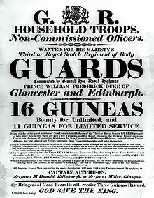 During the American Revolutionary War, a policy similar to the Royal Navy's Press Gangs was introduced. Two acts were passed, the Recruiting Act 1778 and the Recruiting Act 1779, for the impressment of individuals. For some men this would have been for being drunk and disorderly. The chief advantages of these acts was in the number of volunteers brought in under the apprehension of impressment. To avoid impressment, some recruits incapacitated themselves by cutting off the thumb and forefinger of the right hand. Both acts were repealed in 1780.[5] The British Government also released criminals and debtors from prison on the condition they joined the army. Three entire regiments during the American Revolution were raised from this early release programme.[6] Of the Volunteer recruits, some would find they had been enticed to take the King's shilling under false pretenses and many men would find they had signed to a lifetime in the army.[5]
