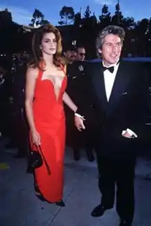 The red Versace dress of Cindy Crawford is the red plunge Versace dress worn by Cindy Crawford at the 63rd Academy Awards on March 25, 1991. The dress worn by the model and designed by Versace was a long evening dress in red, with straps and plunging neckline.[1] The model, accompanied by her boyfriend of the time, the actor Richard Gere, presented the Oscar for Best Set Design along with Susan Sarandon.[2] The Oscar red carpet of 1991 represents the first official occasion where Gere and Crawford were shown together as a couple.
