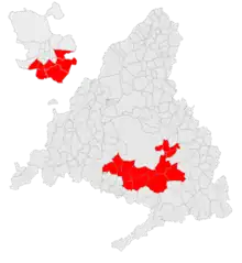 The expression red belt (Spanish: Cinturón rojo) is used to designate in the Community of Madrid, since the return to democracy in the last decades of the 20th century, the set of cities located in the southern part of the metropolitan area of the city of Madrid, characterized by their high population of workers or working class and because of their long history with mayors of the Spanish Socialist Workers Party or other left parties and coalitions such as the Communist Party of Spain or the United Left, representing a total of 21% of the population residing in the Community of Madrid, with six out of the ten most populated municipalities of the region belonging to the red belt.[1][2][3][4] The name is also used to talk about the southern districts of the city of Madrid.[5]