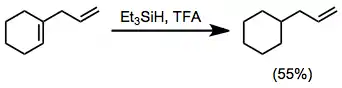 Hydrosilanes can reduce 1,1-disubstituted double bonds that form stable tertiary carbocations upon protonation. Trisubstituted double bonds may be reduced selectively in the presence of 1,2-disubstituted or monosubstituted alkenes.[15]