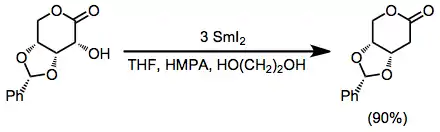 α-Functionalized carbonyl compounds are reduced to afford the corresponding carbonyl compounds. A number of functional groups can be replaced with hydrogen using this method; one transformation that is relatively unique to samarium(II) iodide is the reduction of α-hydroxy ketones and α-hydroxy lactones. In general, α,β-diheterosubstituted lactones may eliminate to give unsaturated lactones upon reaction with SmI2, although the use of ethylene glycol as a proton donor minimizes this process[17]