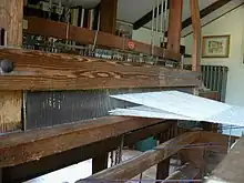 A reed is part of a weaving loom, and resembles a comb or a frame with many vertical slits.[1] It is used to separate and space the warp threads, to guide the shuttle's motion across the loom, and to push the weft threads into place.[2][3][1] In most floor looms with, the reed is securely held by the beater.[1] Floor looms and mechanized looms both use a beater with a reed, whereas Inkle weaving and tablet weaving do not use reeds.