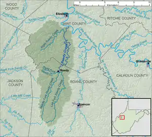 Reedy Creek is a tributary of the Little Kanawha River in western West Virginia in the United States. Via the Little Kanawha and Ohio rivers, it is part of the watershed of the Mississippi River, draining an area of 133 square miles (340 km2)[5] in a rural region on the unglaciated portion of the Allegheny Plateau. It is 22.6 miles (36.4 km) long, or 38.5 miles (62.0 km) long including its Left Fork.[6]