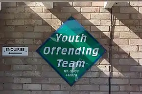 In England and Wales, a youth offending team (YOT) is a multi-agency team that is coordinated by a local authority and overseen by the Youth Justice Board.[1] It deals with young offenders, sets up community services and reparation plans, and attempts to prevent youth recidivism and incarceration. YOTs were set up following the Crime and Disorder Act 1998[2] with the intention of reducing the risk of young people offending and re-offending, and to provide counsel and rehabilitation to those who do offend. Youth offending teams engage in a wide variety of work with young offenders (those under 18) in order to achieve their aims. YOTs supervise young people who have been ordered by the court to serve sentences in the community or in the secure estate. Sometimes, teams organise meetings between offenders and victims to encourage apologies and reparation.
