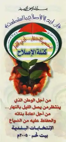 Reform Bloc (Arabic: كتلة الاصلاح, Kutla Al-Islah) was a candidature list that contested the May 2005 municipal elections in Bethlehem, the West Bank. The list was launched by Hamas. In total, the Bloc presented 7 candidates. The top candidate of the Bloc was Hassan al-Masalman.[1]