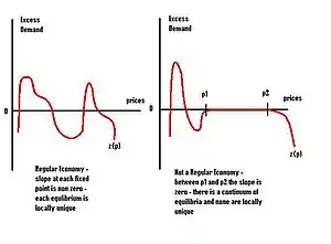 A regular economy is an economy characterized by an excess demand function which has the property that its slope at any equilibrium price vector is non-zero. In other words, if we graph the excess demand function against prices, then the excess demand function "cuts" the x-axis assuring that each equilibrium is locally unique. Local uniqueness in turn permits the use of comparative statics - an analysis of how the economy responds to external shocks - as long as these shocks are not too large.