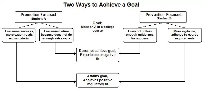 E. Tory Higgins uses this example: there is Student A and Student B, and they both have the shared goal to make an A in a class they are both taking in college. Student A uses a promotion-focus orientation which slants them towards achieving their goal and towards advancement, growth and life accomplishment. This would cause Student A to view the goal as an ideal that satisfies their need for accomplishment. Student B uses a prevention-focus orientation where the goal is something that should be realized because it fulfills their need for security, protection and prevention of negative outcomes. Student A uses an eager approach where they read extra materials to obtain their goal of an A. Student B uses a vigilant approach where they become more detail oriented and pay careful attention to completing all of the course requirements.[9]