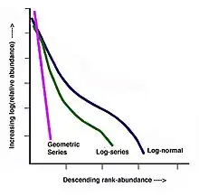 Figure 4. Generic Rank-abundance diagram of three common mathematical models used to fit species abundance distributions: Motomura's geometric series, Fisher's logseries, and Preston's log-normal series (modified from Magurran 1988)[10]