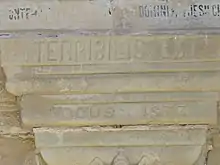 Among Saunière's external embellishments was the Latin inscription Terribilis est locus iste displayed prominently on the lintel of the main entrance; its literal and most obvious translation is "This place is terrible";[14] the rest of the dedication, over the doors' arch, reads "this is God's house, the gate of heaven, and it shall be called the royal court of God." The quotation comes from Genesis 28:17.[15]