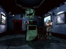 Several of the Resident Evil mansion's pre-rendered backdrops were inspired by The Overlook Hotel, the setting for the 1980 horror film, The Shining.[29] Mikami also cited the 1978 film Dawn of the Dead as a negative inspiration for the game.[lower-alpha 4][30][31] The game was initially conceived as a fully 3D first-person update of Sweet Home (influenced by the game's first-person battles), with action and shooting mechanics. A first-person prototype was produced, and initially featured a supernatural, psychological Japanese horror style similar to Sweet Home, before opting for an American zombie horror style influenced by George Romero films. During production, Mikami discovered Alone in the Dark (1992), which influenced him to adopt a cinematic fixed-view camera system. Mikami said that, if it was not for Alone in the Dark, Resident Evil would have had a first-person view instead.[17][32] Mikami was initially reluctant to adopt Alone in the Dark's fixed-view camera system, saying it "had an effect on immersion, making the player feel a bit more detached", but eventually adopted it because the use of pre-rendered backdrops allowed a higher level of detail than his fully 3D first-person view prototype, which "didn't get along so well with the original PlayStation's specs."[19] A concept art claimed to be of the original first-person prototype has been available since the 1990s, showing more similarity to Doom rather than Alone in the Dark.[33] A first-person perspective was not used again for the mainline Resident Evil series until Resident Evil 7: Biohazard (2017).[34]