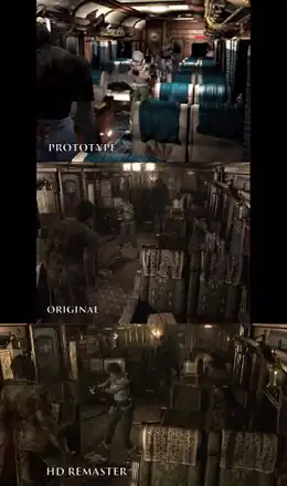 Top to bottom: The Nintendo 64 prototype (2000), original GameCube release (2002), and high-definition remaster (2016). In each scene, Rebecca can be seen taking aim at an enemy during the opening train scenario.