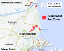 A residential red zone is any of several areas of land in and around Christchurch, New Zealand, that experienced severe damage in the 2010 and 2011 Christchurch earthquakes and were deemed infeasible to rebuild on. Through voluntary buyouts, the Crown acquired and demolished or removed over 8,000 properties.[1]:5 The majority were located in a broad swath of the eastern suburbs along the Avon River / Ōtākaro that had suffered damage from soil liquefaction.