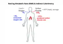 Indirect calorimetry is the study or clinical use of the relationship between respirometry and bioenergetics, where the measurement of the rates of oxygen consumption, sometimes carbon dioxide production, and less often urea production is transformed to rates of energy expenditure, expressed as the ratio between i) energy and ii) the time frame of the measurement. For example, following analysis of oxygen consumption of a human subject, if 5.5 kilocalories of energy were estimated during a 5-minute measurement from a rested individual, then the resting metabolic rate equals = 1.1 kcal/min rate. Unlike some related measurements (e.g. METs), RMR itself is not referenced to body mass and has no bearing on the energy density of the metabolism.