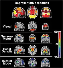 - ↑ Damoiseaux JS, Rombouts SA, Barkhof F, Scheltens P, Stam CJ, Smith SM, Beckmann CF (September 2006). "Consistent resting-state networks across healthy subjects". Proceedings of the National Academy of Sciences of the United States of America. 103 (37): 13848–13853. Bibcode:2006PNAS..10313848D. doi:10.1073/pnas.0601417103. PMC 1564249. PMID 16945915.