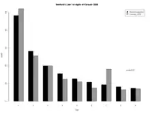 Columbia University Ph.D. candidates Bernd Beber and Alexandra Scacco have released an analysis concluding that the patterns of the last two digits of the election results contain characteristics of human manipulation. The province vote totals possess oddities, including too many sevens in the last digits and too few fives, as well as too few non-adjacent ending digits. The authors of the report concluded that the probability of such oddities occurring naturally is only one chance in 200.[39] After their publication, a mathematician noted that the authors had made a computational error, and that the correct probability is lower, 0.13%; this correction was confirmed by Beber and Scacco.[40] However, Zach at AlchemyToday pointed out that the tests suffer from issues of post-hoc test selection and concluded that by Pearson's chi-square test the results did not meet confidence intervals for being non-random.[41]